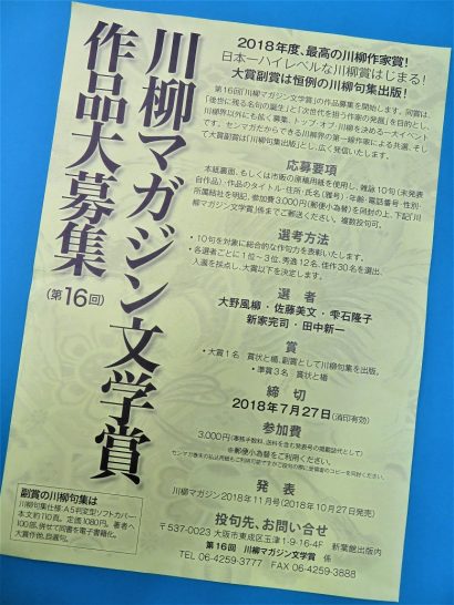 【投句先、お問い合せ】 〒537-0023 大阪市東成区玉津1-9-16-4F新葉館出版内。第16回川柳マガジン文学賞係。TEL06-4259-3777  FAX06-4259-3888