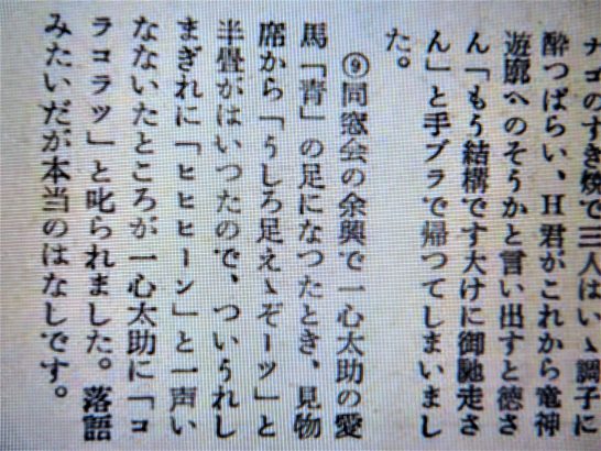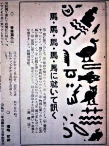 今回の更新、私はまだすべてを読んでいませんが「おもしろいな~!」と思ったのは、320号の24ページに載っている須崎豆秋さんのエッセー。320号は昭和29年(午年)1月号であり、それにちなんで【馬・馬・馬に就いて】同人諸兄に訊ねたもの。質問は①馬に乗ったこと。②馬肉を食べたこと。③ろ馬に乗ったこと。④競馬ですったこと。⑤木馬に乗ったこと。⑥竹馬に乗ったこと。⑦左馬を書いたこと。⑧付け馬を連れたこと。⑨馬の足になったこと。⑩尻馬に乗ったこと、乗らされたこと。以上10問中3問に答えてください。というもので、豆秋さんは①⑧⑨について書いておられる。一応⑨のみ写真でアップしますが、①⑧については、下の「301-400号(昭和27年-昭和35年)」をクリックしてご覧ください。