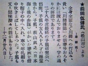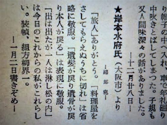 毎週土曜日に更新しています【川柳塔電子化】。本日は321号(昭和29年2月)・805号(平成6年6月)・1057号(平成27年6月)が新しくアップされています。321号では10ページ下段の【飛・燕・往・来】と題された、同人誌友から路郎宛に送られてきた便りが興味深かった。取り敢えずは最初に掲載されている前田伍健のもの(写真②)と、岸本水府のもの(写真③)をご紹介。水府の文中にある【旅人】というのは前年(昭和28年)に路郎が上梓した句集「旅人」のこと。 また、同321号の23ページの下段に【政治と川柳】という本田恵二郎のエッセーあり。えらく硬い表題に警戒しながら近づいたが、真実を突いた佳作だった。