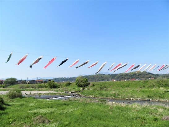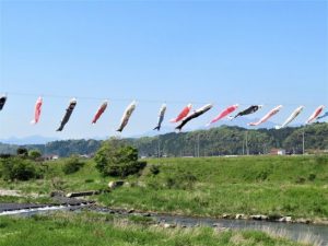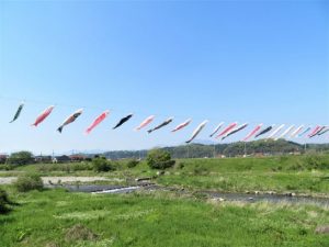 写真①、加勢蛇川(かせだがわ)の上流と新緑の山。②、重忠さんが植えてくれた「シゲタダ桜」。八重桜なので丁度満開だった。④⑤、山からの帰路、杉下橋へ寄って、恒例の「鯉のぼりの川渡り」をパチリ。数えたら大小27匹。(写真では23匹しか見えない)。爽やかな風に吹かれて悠々と泳いでいた。・