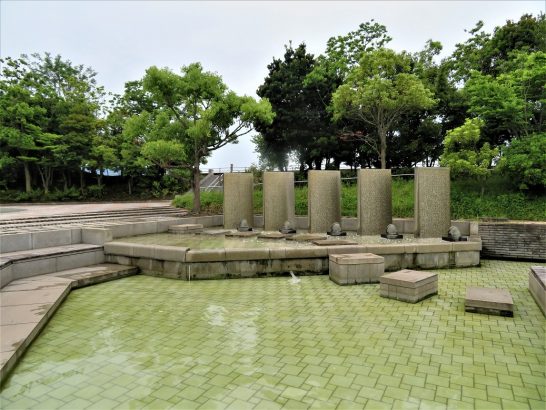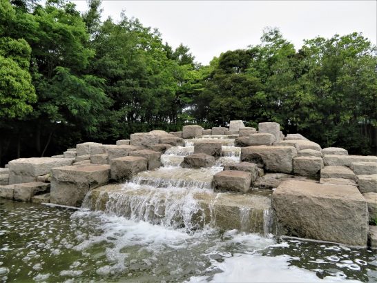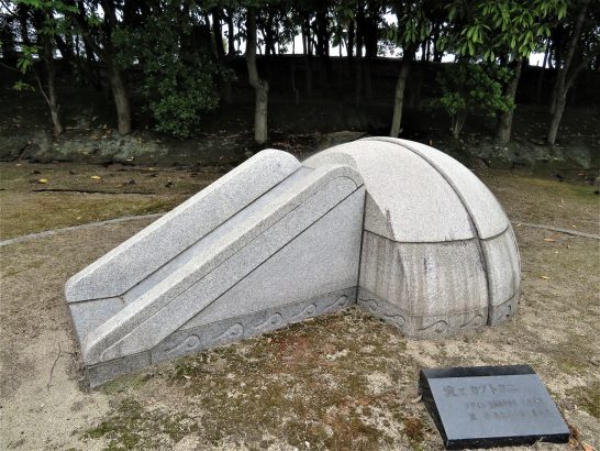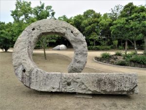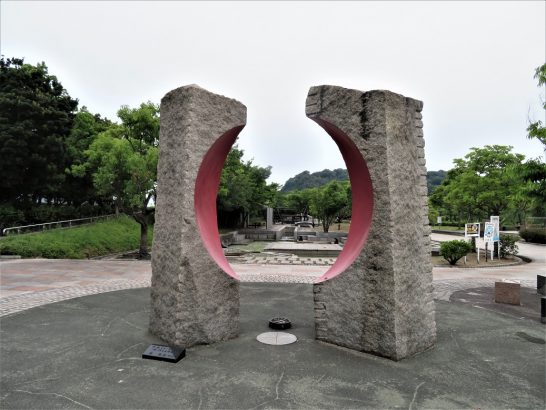 ありがとうございます。この彫刻のあるところ。会場を出て、真正面の植え込みが美しい遊歩道を海側へ行きますと、その遊歩道は左の方へ曲がっていて、そのあたりから出てきます。それぞれの作品の下に題名と作者名の書いた銘板があります。次の機会にでもご覧ください。
