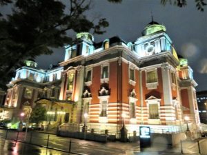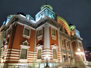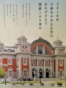 句会終了後、いつものミュンヘンで飲み会。参加者13名。喉が渇いていたので先ず生ビール。のち焼酎湯割り。隣席のMさんが清酒を注いでくださったので、結局三種混合ガンガン。と言っても清酒は猪口2口ほどだけ。愉快に談笑してバイバイ。ホテル帰着は10時過ぎ。いま、頭ふらふらしながら、何度もやり直しながらブログ更新しているところ。瓦版の皆さま、大変お世話になりました。サンキューべりマッチでした~~~!              写真上:午後6時過ぎの中之島中央公会堂(瓦版会場)。あとの3枚は、飲み会へ出かける午後8時半ごろに角度を変えてパチリ。どの角度から撮っても美しい(カラオケの画面背景にしばしば使われている)。写真下は100周年のパンフレットと記念のピンバッジ。買おうと思ったが売店は午後6時に閉まっていた。本日、あちこちウロウロしたので10,210歩。
