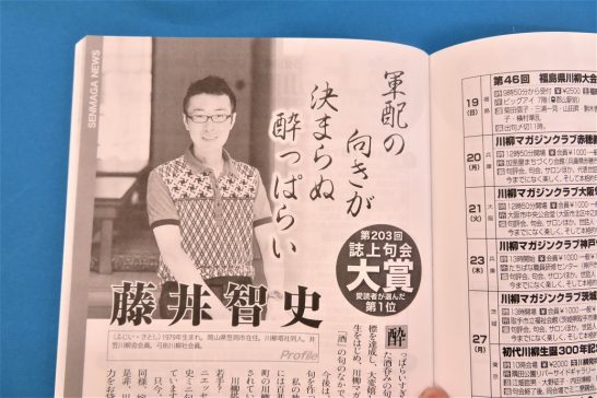 本日、川柳マガジン8月号が到着。パラパラ見ていたら藤井智史さん(川柳塔社同人)の大きな顔写真が出てきたのでビックリ! 読んでみたら、私が選をした【ベスト川柳】で特選に抜いた彼の句が、読者の投票によって、その月(6月号)のトップに選ばれたということ。いわゆる「誌上句会大賞」ということ。毎月20以上ある各選者の特選の中から選ばれたのだからスゴ~イ! 選んだ私も誇らしいことである。もっとも、この【ベスト川柳】は、既発表句でも構わないという珍しいシステム。すなわち、どこかで天位に入賞した句でも構わないということ。従って、他の応募句よりも良い句が揃っているのは間違いない。ちなみに、私が6月に選んだベスト5は下記の通り。