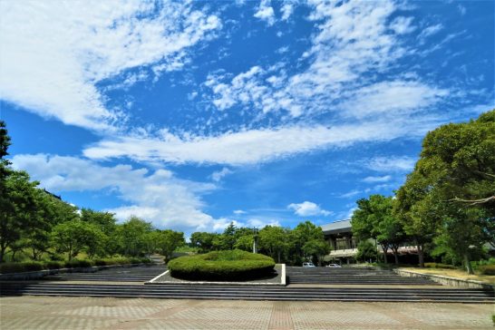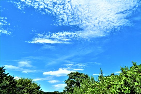 昼前の散歩も夕刻の散歩も、再びハンカチを濡らして首筋に当てて。自販機で冷たいドリンクをゲットして、ようやく7,379歩。総合公園の上の雲は微かに秋の気配、という感じもするのだが…(写真上)。