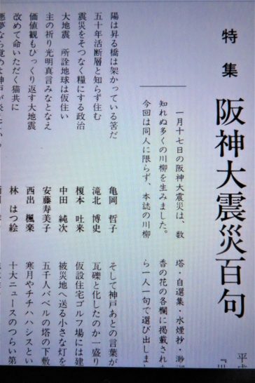 毎週土曜日に更新している【川柳塔誌電子化】、本日は、335号(昭和30年4月)・819号(平成7年8月・特集阪神大震災100句)・1043号(平成26年4月)。この3冊がアップされています。819号の特集に私の句も入っているのか? サイトのページを繰ったら、出てきた~~!(下のサイトからご覧ください)