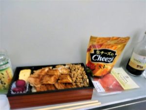 はっはっは、ほんま子供や。買って来たもの広げて写真撮っていたら、隣席(通路向こう)の兄ちゃんが「なにしとんねん」という顔で見ていました。