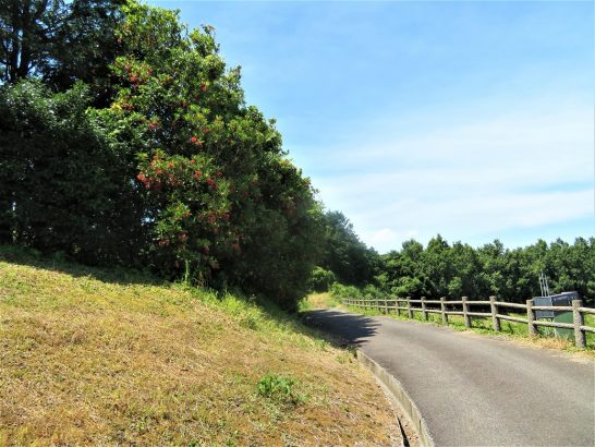 写真①、昼前散歩にて。大山の上あたりにモクモクと夏雲。②、総合公園遊歩道脇の珊瑚樹も真っ赤に色付いてきて「そろそろ秋ですよ」と言っていた。本日7,404歩。
