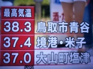 本日、台風の影響なのか朝から熱風が吹いて、鳥取県内の最高気温は青谷で38,3℃!! こちら琴浦町も同じぐらいあったのではないか。昼前散歩に出ようとしたら「こんな暑いのに、やめときなはれ!」と足を引っ張る人が約1名。寒さには弱いが暑さには強い小生。「この程度に負けてたまるか!」と、いつもの総合公園まで車で出かけたが車の外気温計は37℃!。駐車場の自販機からよく冷えた「ピーチネクター」をゲットして一気に飲んで歩き出したが、露出している首筋と二の腕が熱い。アバウト25分歩いて駐車場に戻ったら汗びっしょりで、また喉が渇いていた。夕刻散歩時には熱風が温風ぐらいになっていたが、やっぱり暑かった。本日7,876歩。
