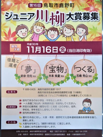 毎年行われている【鹿野ジュニア川柳】の募集要項が届きました(写真上)。応募資格は小学生と中学生です。皆様のお子さん或はお孫さんにチャレンジしてもらってください。学校単位など応募用紙がたくさんご入用の方は[〒689-0405 鳥取市鹿野町鹿野1517 教育委員会鹿野分室川柳係]宛に請求してください。少しでしたら私宛にご連絡ください(コピー可)。お送りいたします。[〒689-2303 鳥取県東伯郡琴浦町徳万597 FAX専用0858-52-2449]