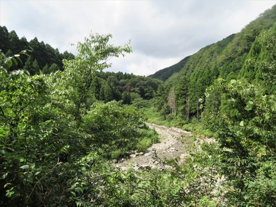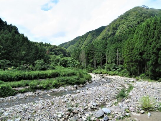 写真①、小屋の真下を流れている加勢蛇川。昨日たっぷり降ったのに水量は少ない。山や森はカラカラに乾いていたので、まだ余って沁み出すほどではないのかもしれない。 ②、バーベキューコーナーから見た加勢蛇川。雑草が1メートル以上伸びていて見晴らしが悪くなっていたので刈り取った。雑木の伐採は自力では無理(足場が崖の上なので危険)。いずれ、プロにでも頼まなければならない。