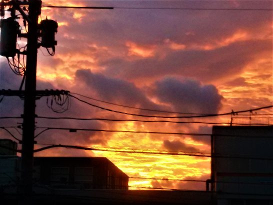 私のベッドの頭は東向きの窓にくっついている。昨夜も窓を開けたまま眠って、目が覚めたときはまだ暗かった。うとうとしていたら「チッチチチ!」と小鳥の声。「もう夜明けか…」とぼんやり窓の外を見たら大火事のような凄い朝焼け! カメラは階下なのでスマホでパチリ(写真上)。左の建物は農協。右は「トピア」という農協マーケット。時刻は5時20分頃だったと思う。だが、数分後には夜が明けて、変哲もない灰色になった。 そして6時に「ピンポンパンポ~~ン!」と町内放送。「本日、台風21号接近のため小学校と中学校は臨時休校になりました。生徒の皆さんは自宅学習を…」ということ。まだ雨も降っておらず無風だったが下校時のことを案じてだろう。おかげで「売店のおばちゃん」の家内も休みで、日曜のようなゆっくりした朝になった。