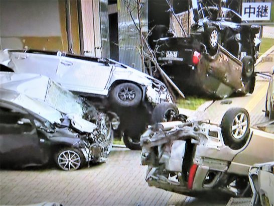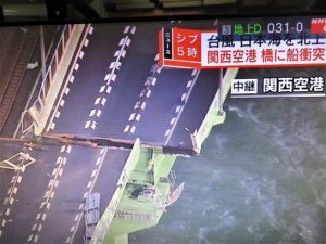 昼前散歩の時間になったが、風が強くなってきたので散歩はパス。だが、こちら鳥取県は台風の西側なので、風雨ともそれほど厳しくなく、終日、何の影響もなくデスクワーク。夕刻のNHK総合ニュースを観ると住之江の駐車場で車が引っくり返されて大破(写真下)。また、関空の連絡橋に流されたタンカーがぶつかって橋がズレていた(写真下)。 ・台風21号は日本海へ抜けましたが、北日本へ向かうようです。進路に当たる皆さま、くれぐれも用心なさってください。本日、散歩せず2,480歩。