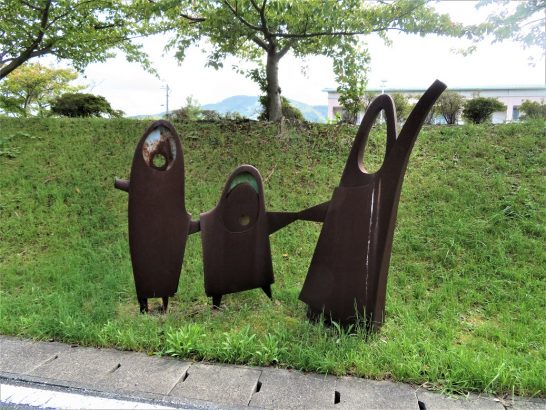 写真: ①、会場の「いわみーる」。黄色いのは海賊芳山の車。その向こうが私の車。②、投句を済ませてから付近を散策。立派な「世界こども美術館」。③、その美術館前のオブジェ。右端はゲゲゲの鬼太郎の「ねずみ男」みたい。④、こども美術館近くの屋外ステージ。⑤、林間を歩いて辿り着いた「海の見える公園」の木製展望台。ベンチがあったので涼風に吹かれてしばし休憩。⑥、その展望台から見た「浜田マリン大橋」。⑦、数年ぶりに立ち寄った道の駅「キララ多岐」。