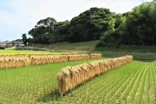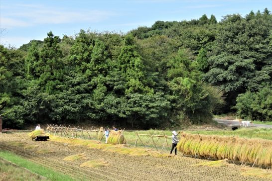 写真上: 1昼前散歩にて珍しく稲架(ハサ)(ハゼ)に掛けられた稲。最近は乾燥機が全盛だが、お日さまに当てたのが旨いので「ハサ米」を契約で作っている農家がある。2その稲架に掛けている作業中。3田圃に整列する彼岸花。向こうに見える建物は「大山乳業」4帰途での定点観測「白兎海岸」。ウエストサイド。記念撮影や波と戯れる観光客が多かった。5イーストサイド。6夕刻散歩で出会った。折鶴のような形をしたバッタ? 7写真の順番は逆になったが、お墓の傍の彼岸花。8墓地の隣の大きな柿の木(誰のか知らない)。熟したままで放置されていて、ポタポタ落果している。勿体ないので1コ頂戴したがメッチャ旨かった。