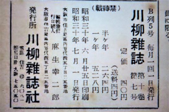 写真 1 2 本日のPC待ち受け画面「タージ・マハル」。 3 川柳雑誌338号(昭和30年7月号)の表紙。 4 その中の記事〔麻生路郎の鑑賞文〕表題及び味のある挿絵。 5 6 鑑賞文の中で取り上げられていた中から2句のみご紹介。 7 同誌の奥付け。1冊40円。年間528円。現在の20分の1ほど。63年前の物価の一端を示している。