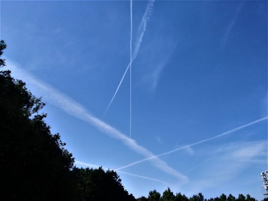 写真上: 本日、昼前散歩にて。紺碧の空に飛行機雲が鮮やかな線を引いていた。高空では温度が低かったのだろう。本日7,331歩。