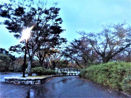 写真上:本日午後5時15分の総合公園。秋雨の中もう外灯が点いていた。    ・     昼前散歩の後半ではポツポツ雨が降り始めていたが、何とか傘も不要で歩き終えた。が、夕刻散歩ではよく降ってズボンの裾がグッショリ。帰宅して着替えた。本日7,281歩。