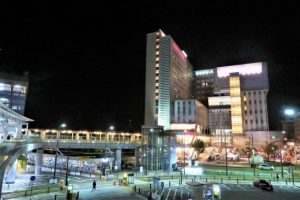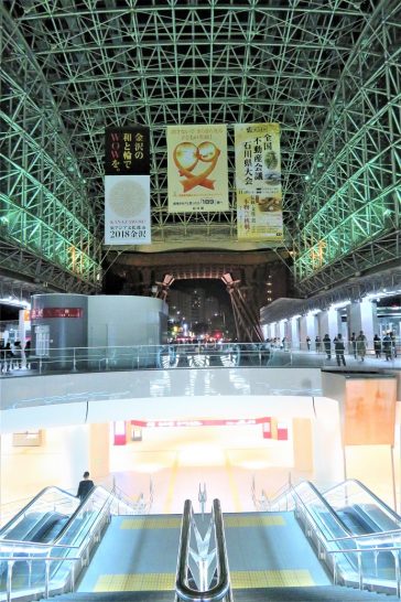 写真上2枚。金沢駅アーチ。3枚目、高岡駅前マンテンホテル。右は隣接の生涯学習センター。