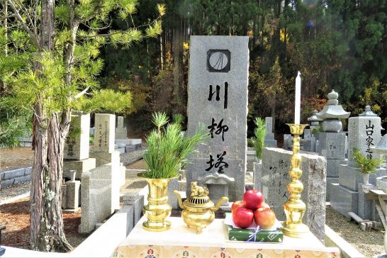 写真 1 川柳塔碑(祭壇やお供えは、毎年お願いしてる石屋さんが段取りしてくれている) 2 奥の院のシンボル?の塔。 3 お墓がいっぱい秋の陽を浴びて和んでいた。