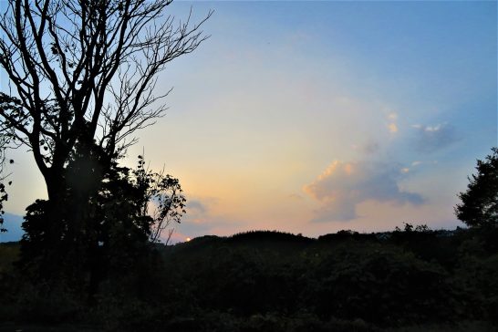 デッカイ落日、想像の翼を広げて下さって、サンキューべりマッチ! 左の木の枝ぶりが面白いシルエットになるので、夕焼けを撮るポイントにしています。