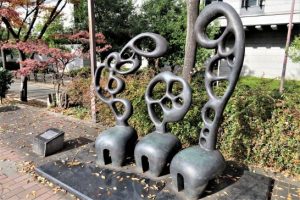 駐車場から公会堂まで【中之島緑道】という遊歩道を通ったが、その脇に幾つかの彫刻あり。下の写真はその1つ。左の銘板には題名「くもの椅子」、作者名「石田眞利」となっていた。「くも」は「雲」だろう。