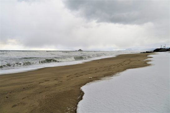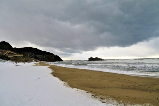 終了後、賀露に向かって走る。途中、白兎海岸に定点観測の波濤を撮ったが、今日の帰途には浜に雪が積もっていたので、そちらの方をアップ。写真上1白兎海岸ウエストサイド。2イーストサイド。