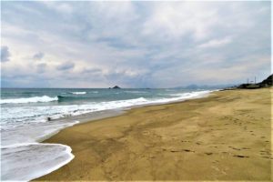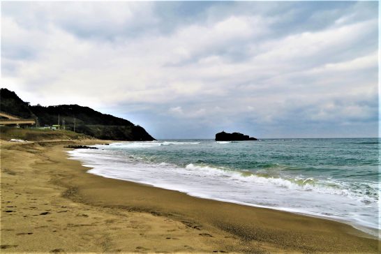 写真上: 1 定点観測「白兎海岸」ウエストサイド。 2 イーストサイド。出発前に昼前散歩をしたが、夕刻はずっと小雨で戦意喪失して散歩はパス。本日4,605歩。