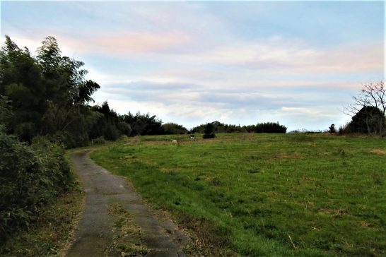 淡い夕映えの下は日本海です。田園ムードのこの小道を通るとかなり遠回りになりますので、横目で景色だけ見てスルーしています。いつも通っている農道は、このカメラを構えている背中のほうにあります。