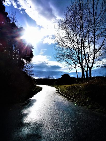 本日、昼前散歩に出ようとしたら本格的な雨。いつものように傘を差して歩こうかとも思ったが、イマイチ気が乗らなくてパス。気が乗らなかった原因の第1は「愛染帖」の選評が片付かず「キリ」がつかなったからだと思う。で、外出せず引き続きデスクワーク。午後3時半頃にすべて完了。雨も上がりかかっていたので、外出して散歩。雨上がりの道が逆光で光っていた。写真上:いつもの構図の午後4時前。本日4379歩。