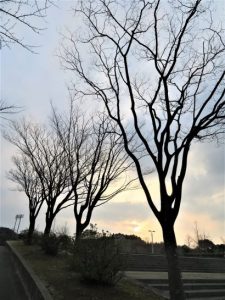 本日、風は冷たかったが、昼過ぎまでは青空の広がる好天で散歩のときに見上げた空も、うらうらと春の趣きだった(写真・11時40分頃)。また、夕刻散歩に出たときは一面の雲だったが、歩いている内に西空から雲が切れて夕陽が顔を出したのでパチリ(写真2・午後5時30分頃)。本日8033歩。
