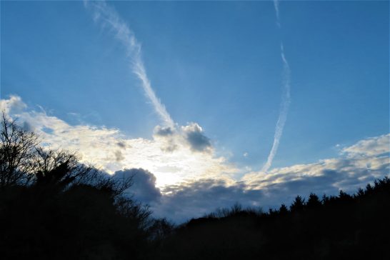 本日、朝10時から家内が臨時のコーラス練習ということで出て行ったので、久しぶりの店番。開店休業のような店なので、レジ―横の机で今朝コピーした【大山滝句座・会報】を袋詰め・宛名シール貼りなど、午後には発送完了。そのような事情で午前中は散歩できずウロチョロしてようやく2000歩ほど。午後4時過ぎから散歩に出てようやく7299歩。写真2 散歩中の午後4時30分頃の空。飛行機雲が2つ崩れかかっていた。