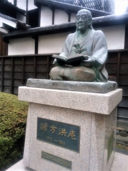 本日、第1水曜日にて医光寺坐禅会例会日。午前5時10分前起床。5時15分出発。5時30より結跏趺坐、アバウト40分。終了後、般若心経&ミニ法話を頂戴。のち別室にて粥と漬け物&茶菓子とお茶をいただいてしばし談笑。7時前に辞去して、国道9号線~鳥取道~中国道~阪神高速を走って、南久宝寺問屋街着は11時前。問屋2軒よりチマチマ仕入れ。のち本日の宿泊「ホテル・アウィーナ」の駐車場へ車を置いて、瓦版の会場の大阪市中央公会堂着は定刻の1時10分前。投句を済ませた後、周辺をぶらぶら散歩していたら、公会堂から5分ほどのところに緒方洪庵の住居と銅像があった。