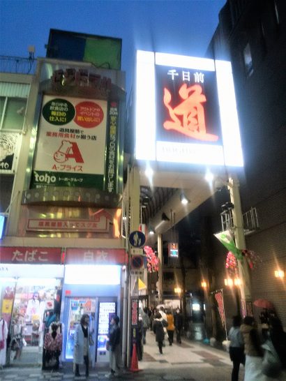 写真下。1本日の難波夜景。右は高島屋。2でっかい「道」は道具屋筋の目印。3道具屋筋の店先。4購入した箸と箸入れ。