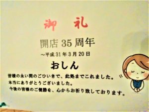 おしんちゃん 開店35周年 おめでとうございます。❗こんなに続くって とっても大変なことですよね。お客さまあってのことかも知れないですが、お互いの相性がうまくあってのことでしょう。