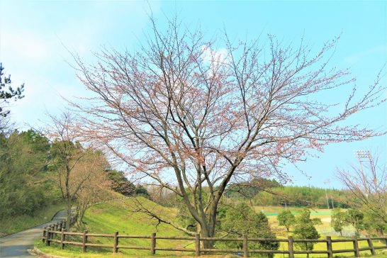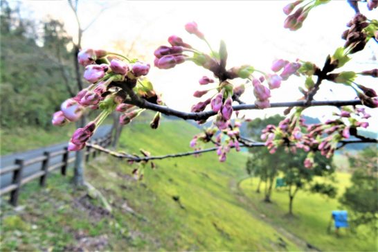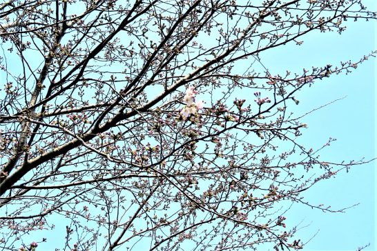 近くの公園の桜 まだまだと思っていたら なんと❗ 一枝が5分咲きくらいに なっていた❗ ビックリでした。(笑)
