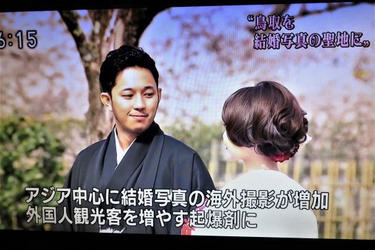 夕刻のローカルニュースを観ていたら、「鳥取県を結婚写真の聖地に」というキャッチフレーズが出てきた。いま、アジア各地では「海外で結婚写真を撮る」というのが流行っているとのこと。写真下はテレビ画面を写したものだが、この和服のカップルはシンガポールから来たのだという。本日7288歩。