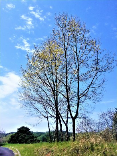 写真、昼前散歩の青空と若葉。本日、鳥取地方の最高気温25℃を超える夏日だったとのこと。2、左上の山桜が、僅かな風でひらひら散っていた。本日6269歩。