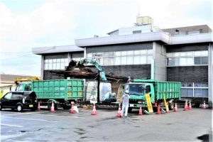 今日は土曜日なので、9時前までのんびり朝寝坊を楽しんでいたら、頭の上の方(東側の窓の方)から「ガリガリッ!」とか、工事中のような音。「はて、何の工事?」と思って、着替えてから窓を開けたら、拙宅前「農協の建物」の玄関前のヒサシ(アプローチの屋根)を撤去していた(写真上・駐車場まで出てパチリ)。かなり頑丈に出来ているようで、本日は屋根部分を撤去しただけで、骨組みは残っていた。本日、6934歩。