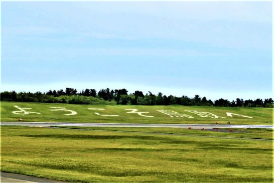 はい、この文字は空港ビル屋上の展望台から見えるのですが、滑走路を挟んで向こう側にありますので詳しくは分かりません。この写真もかなりズームアップしています。たぶん緑色は芝生で白いのは砂か土だと思いますが、定かではありません。