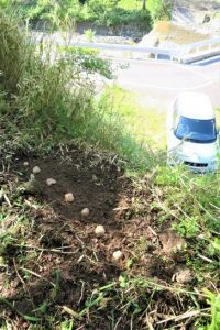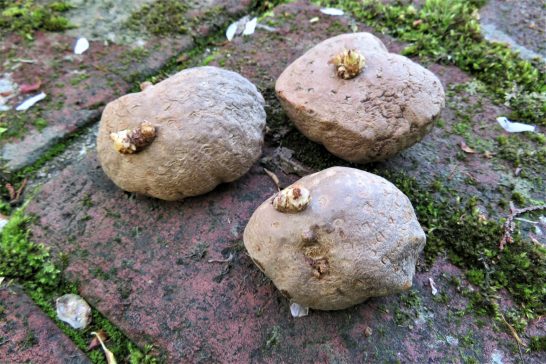 まだ芽が出ていませんでしたが、もうそろそろと思って植えました。大小5個だけですがきっと育つと思います。楽しみです(*^_^*)