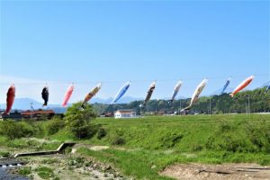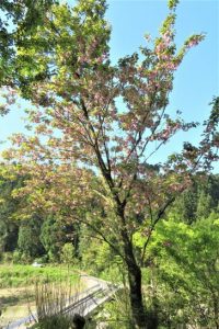 写真小屋敷地の西端から大山の方角を見る。2水を汲みに行った河原(加勢蛇川)   3植え込み前の宇宙芋(芽が出ている)植え込みの間隔が狭すぎたか?と思ったが、もう耕すパワーがなかったので、このまま土を被せた。5田中重忠さんが植えてくれたシゲタダサクラが満開だった。珍しく道の向こうに軽トラが走っていた。6新緑に包まれた小屋。1996年に完成。ということは筑後23年。テラスはボロだが小屋本体はまだ大丈夫。7帰路、いつもこの時期にアップしている「法万橋」鯉のぼりを撮って、帰宅は10時。