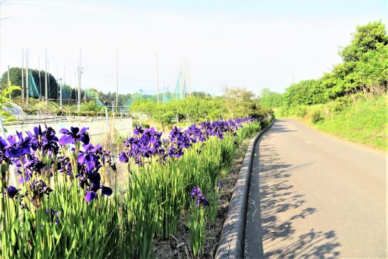 写真1、夕刻散歩(午後4時40分頃)にて。久しぶりに私のパワースポット【東伯第三跨道橋】から東側の第二跨道橋を見る。2、綺麗に咲きそろったアヤメ?カキツバタ? 3、買い物から帰宅した家内が「ガラガラポンで当たった~!」と抱えてきたカーネーション。本日8264歩。