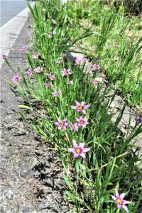 写真1、昼前散歩のとき、飛行機雲が綺麗だったので、カメラを構えたら、太陽の周りに丸い虹がかかっていたのでパチリ。2、道路際に可愛い花。3、テニスコート横にも黄色い花がいっぱい。