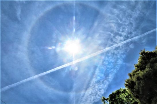 「太陽の回りの丸い虹」で検索したら「珍しい」と出ていました。以前にも見つけたことありますが、こんなに綺麗ではなかった。加えて飛行機雲がダイナミックにしていますね。グッズタイミングでした。