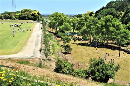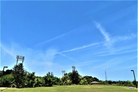 写真、四角い模様を描いていた飛行機雲。2、総合公園にて。保育園児もお母さんたちもシャボン玉を飛ばしていた。3、サッカー場では、高齢者がグランドゴルフ。下の広場では子供たち。上と下の年齢差は70歳ほど?