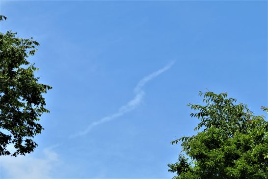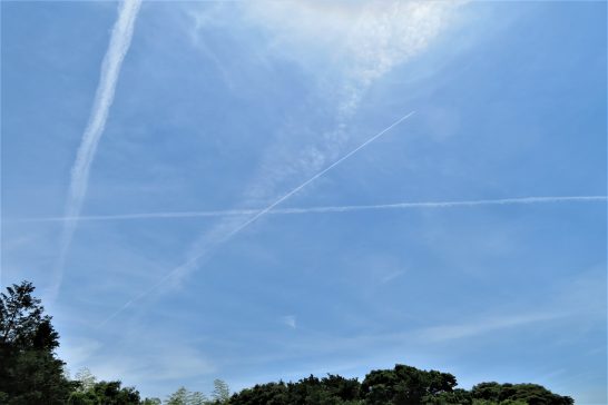 写真1、昼前散歩にて。飛行機雲が鮮やかだった。左下から右上にかけての鋭いのは延びている途中。2、総合公園駐車場の上にて。しろへびのような雲(飛行機雲の切れ端)。