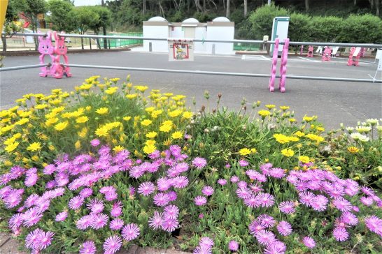 写真: 昼前散歩にて。総合公園隣接の「こども公園」横に完成間近のトイレ(奥の可愛い建物)と手前の植え込み。トイレ、完成してからカメラを向けていると誤解されかねないので、今のうちにご紹介。本日、夕刻散歩を少し早めに切り上げたので6891歩。