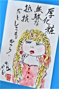 写真1、本日、夕刻散歩にて。久しぶりの八橋小学校西側の通学路。天気が持ち直して青葉が鮮やかだった。2、同じく夕刻散歩にて、アザミの花に蝶々(黒揚羽??)。蜜を吸っていたのか、ずっとヒラヒラ舞っては止っていた。3、昨日、帰宅したら届いていたパワフルな絵手紙。どなたかに似ている健康的で色っぽい別嬪さんの表情がなかなか良い。 ひとりでニヤついているのは勿体ないので、全国の諸兄にご紹介致します。作者は沖縄の大田かつらさん。アップするのは了解済みです。本日、夕刻散歩のみ頑張って5952歩。