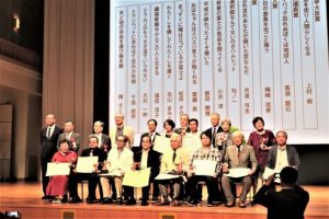 懇親会の参加者は275名ほど? 12人掛けの丸テーブルが25席。満席なら300名だがほとんどが11人だったのでやはり275名。表彰式のセレモニー(※)が1時間ほどあって腹ペコ。やっとこさの乾杯のビールが旨かった!が、すぐに焼酎の湯割りを作ってもらってグビグビ。ビールを注ぎにきてくださったらビール。清酒を注ぎに来て下さったら清酒を頂戴して3種混合ガンガン。終了後、顔見知りの静岡の皆さんたちと二次会はカラオケ。参加メンバーは30~40名?酔っぱらっていたので不明。それでも広々とした部屋だったのでゆっくり座れた。いきなり「アメリカ橋」のリクエストを頂戴して熱唱。酔っぱらっていたので少し遅れ気味だったが86点だった。カラオケで愉快に騒いだのは2時間ほどだったか。ラーメンを食べに行こうという声も聞こえたが、腹いっぱいだったのでホテルに帰ってバタンキューと寝てしまった。
