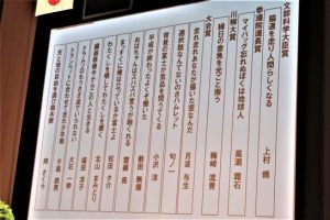 写真6、12時過ぎからの記念講演は尾藤川柳さんの「新発見! 北斎と川柳」。北斎が川柳作家でもあったという興味深い内容だった。7、事前投句4題と当日投句3題、それぞれの秀句3題、合計21句から第二次選者によって選ばれた入賞句14句。この写真では作者と作品が分かりにくいかもしれませんが、「全日本川柳協会」で検索すると協会サイトでも数日中に公表されます。8、入賞者と二次選者の記念撮影。川柳塔社同人では髙瀬霜石さんと小沢淳さんが入賞。9、帰途の新幹線の窓から。名古屋駅の南側。何ができるのか大規模な工事中だった。10、岡山から乗車した「特急やくも」(午後7時4分発)に乗車してすぐにひとり宴会。弁当は大会の昼食だったもの。昼前になっても空腹ではなかったので「夕食にしよう」とバッグに入れていた。(昼近くに駅まで散歩したら減ってきたので蕎麦屋で天麩羅蕎麦を食った)。獺祭と珍々豆はそれぞれ別嬪さんから頂戴。焼ししゃもと韓国のりは岡山駅売店にてゲット。11、鳥取行に乗り換えの伯耆大山駅に到着前の「やくも・自由席」。